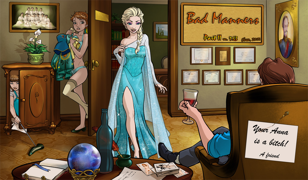 So, if you are a fan of corruption games with an interesting plot, if you love to teach girls good manners, if you want to see how the proud queen Elsa and her red-haired Anna obediently take their panties off for Hans (and for you), we recommend you to pay your attention to "Bad Manners". Especially since a new version, 3.2, was released very recently!